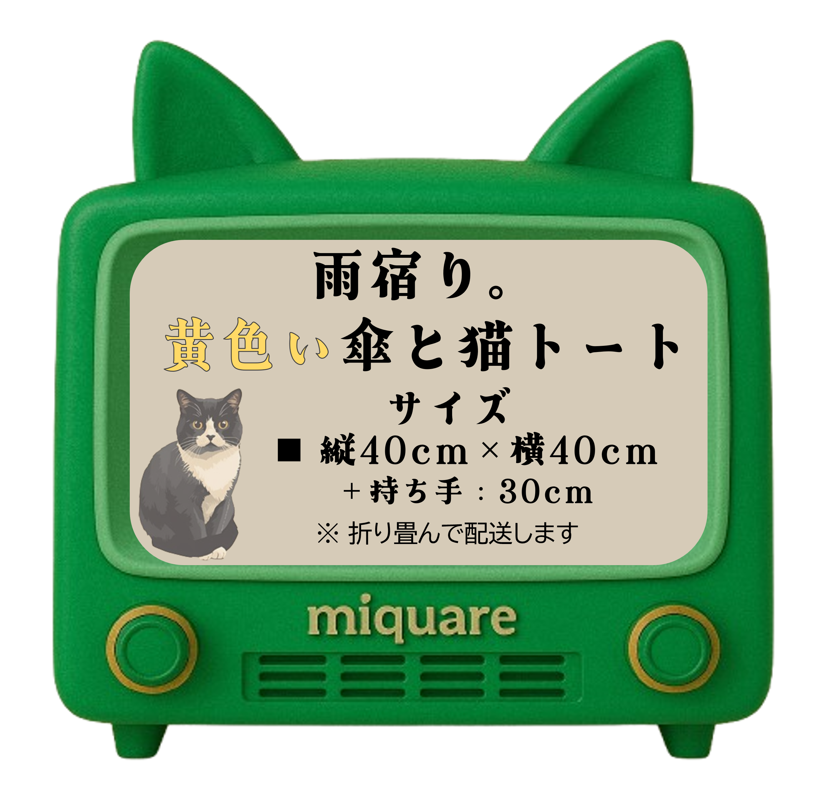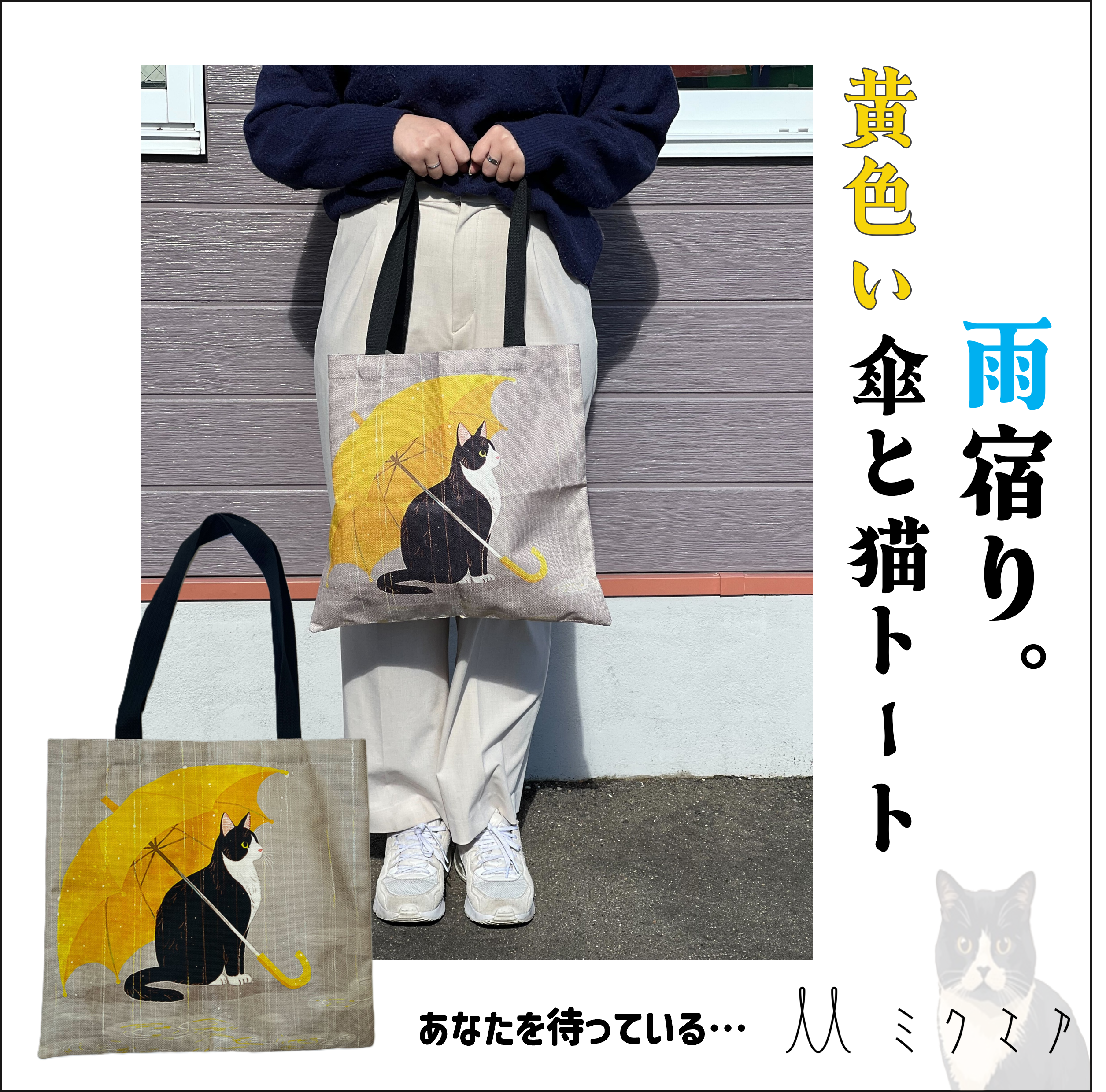 雨宿り。黄色い傘と猫トート。